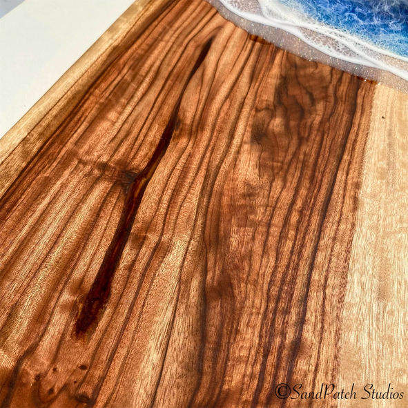 Beautiful 65cm x 27cm solid piece of live edge camphor laurel charcuterie board with sparkling blues.